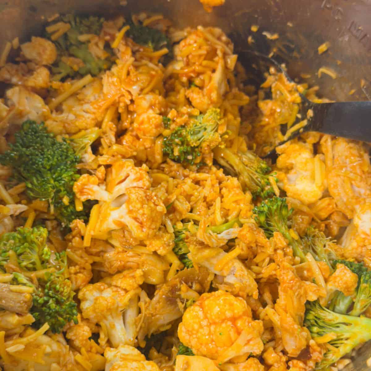 Step 1: Add cooked chicken, broccoli, cauliflower, and buffalo sauce to your Instant Pot. Set the pressure cooker setting to high pressure for 1 minute. Quick release the pressure immediately.